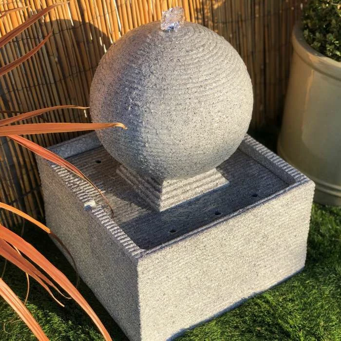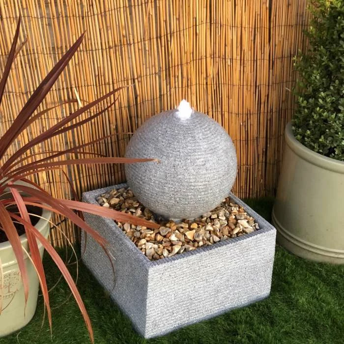 The high quality poly-resin rippling sphere water feature has a realistic granite look finish, which is illuminated with LED lighting in the top of the ball, tranquilly cascading into the base feature which can be dug into the ground if so wished. The fountain is fully self-contained and easy to install, simply plug and play. Weatherproof polyresin water features have a modern and sleek design which will suit any outdoor setting and enhance the beauty of your garden or patio. Garden art by day, illumination by night.