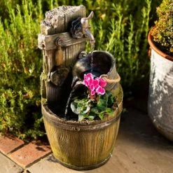 Plug it into the mains to turn on the tap, and enjoy endless flowing water from bucket to barrel and calming streaming sounds in your little garden oasis. This cascade water feature is made from UV- and frost-resistant polyresin and fibreglass (to resist life’s wears and tears) and cast in the shape of a bucket, barrel and tap. With an internal water reservoir, you can place this on any floor or table as an interesting talking point and calming noise maker. With LED lights to illuminate the water flow and feature, you can enjoy every part of this fountain come day or night and, as a bonus, there’s space for a little plant so you can add your own personal touch!