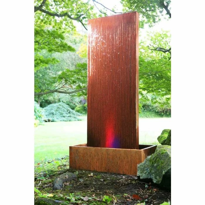 This magnificent water wall feature is fully self-contained and manufactured from Corten steel, which provides it with its spectacular unique appearance. As water flows gracefully down both sides of the feature the Corten steel reacts to create a layer of rust, thereby oxidising the surface to provide weatherproof and corrosion-resistant qualities as well as a striking rustic aesthetic. Weathered steel is quickly becoming a staple of modernistic architecture and the rapturous talking point of designers, praised for its unique contemporary style.
