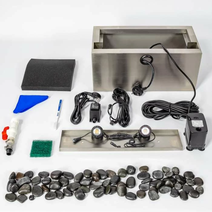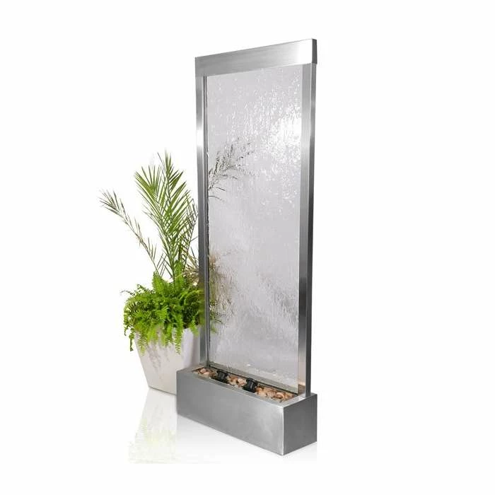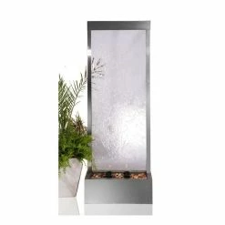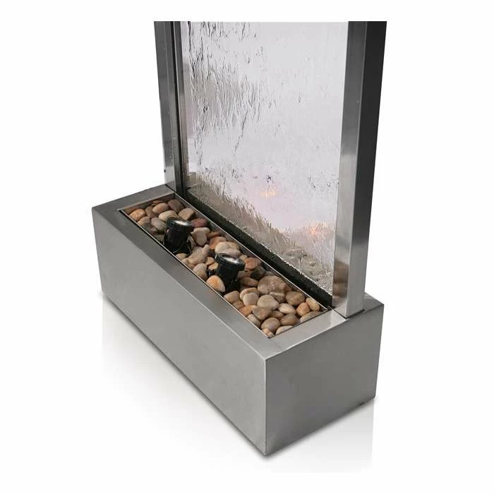 This magnificent cascading water feature is a sleek and contemporary product that will provide the perfect finishing touch to any home, garden or office space. Made from high quality stainless steel, it features a large glass sheet in which the water will flow down and two halogen lights that will illuminate the glass in the dark, creating an enchanting effect.