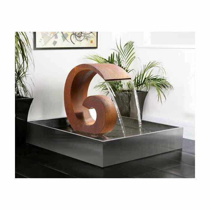 This magnificent water feature is manufactured from Corten steel, which provides it with its spectacular unique appearance. As water flows from the spout of the feature, the Corten steel reacts to create a layer of rust, thereby oxidising the surface to provide weatherproof and corrosion-resistant qualities as well as a striking rustic aesthetic. Weathered steel is quickly becoming a staple of modern architecture, praised for its unique contemporary style. Contrast the fountain’s corten steel with the included stainless steel reservoir, which makes this feature suitable for indoor use.