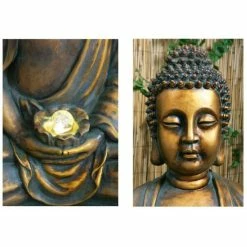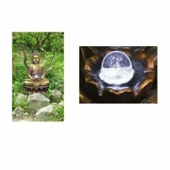 This stunning, antique, gold-effect Buddha will make a wonderful addition to your garden, conservatory, or any other indoor or outdoor area. It features a crystal-like sphere that amazingly appears to float on the water itself, casting a magical glow when the LED lights highlight the feature. Watch the water calmly flow out of the lotus flower, through the Buddhaâs hands, and into the reservoir below.