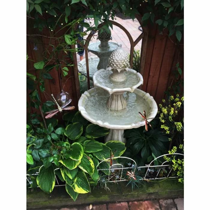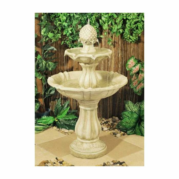 This attractive tiered fountain would make a great focal point in any setting. Made from polyresin and given a beautiful antique ivory finish this lovely feature is bound to draw admiring glances. The water pours out from the pineapple on the top and gently cascades down to the bowls below creating a calm trickling sound.